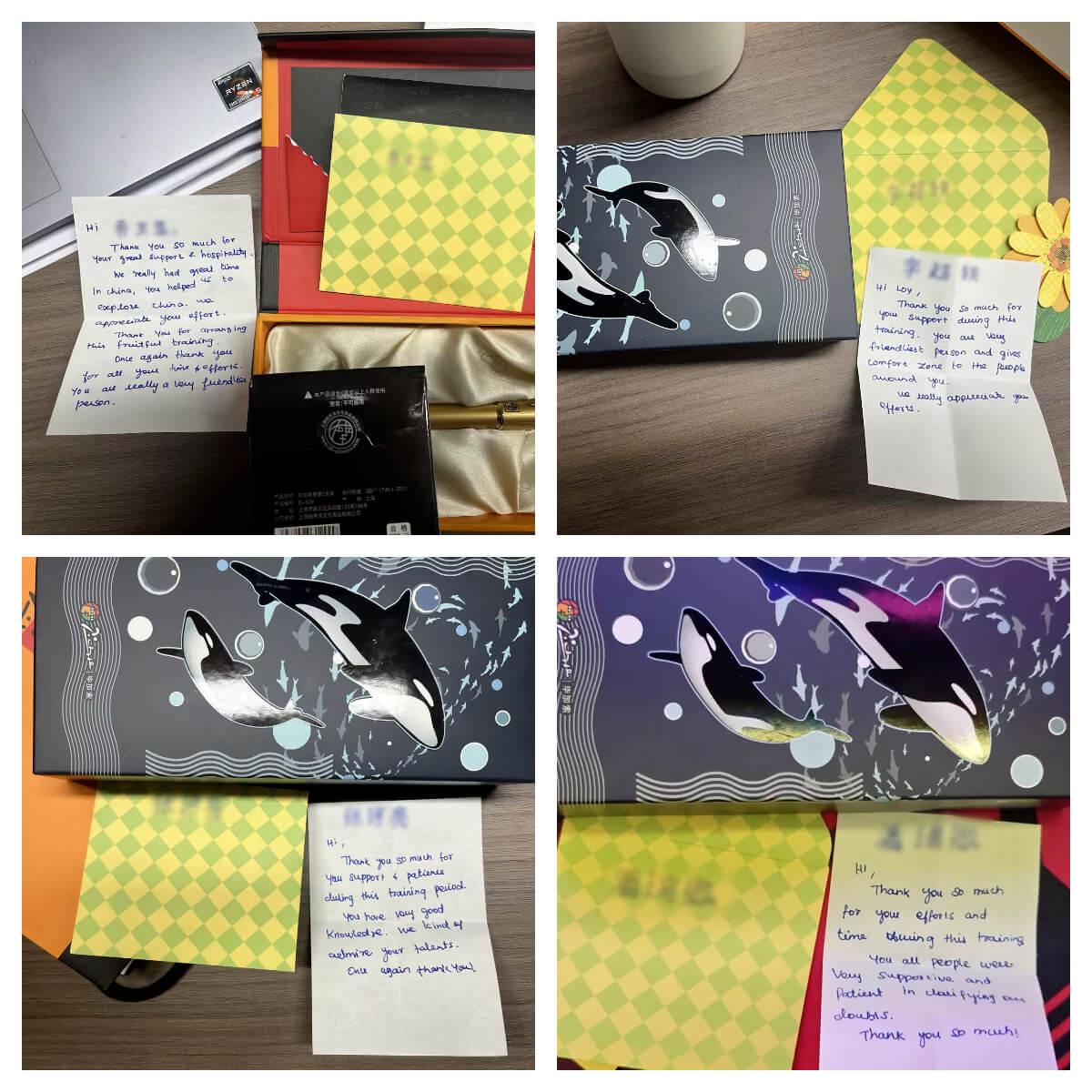 近日,710公海寰宇为来自海外的合作伙伴开展的定制化培训项目圆满收官。在这场为期半个月的深度交流中,双方不仅碰撞出专业领域的智慧火花,更在朝夕相处中结下深厚情谊。临别之际,客户代表向我司四位核心员工赠送了象征友谊的定制钢笔,并亲笔写下四封饱含谢意与真诚的贺卡,为这段跨国合作添上一抹温情注脚。